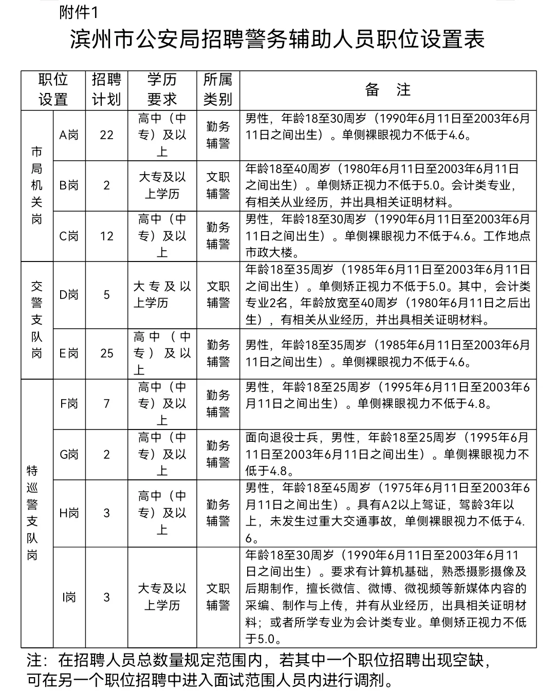 招聘职位及要求详见《滨州市公安局招聘警务辅助人员职位设置表》(附件1)。